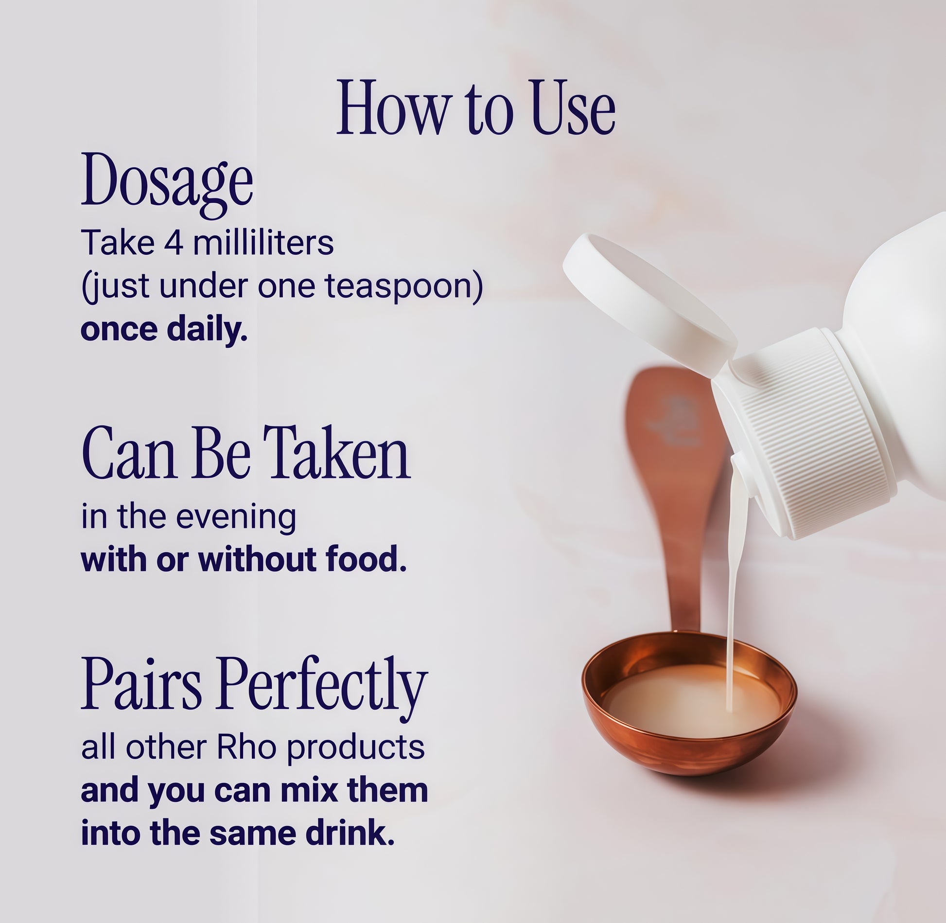 We recommend taking 1 serving per day, 4 ml, which is just under 1 teaspoon. it can be taken directly but to bebest enjoyed we recommend stringing it into cold water or juice or mixing it into your favorite smoothie for adelicious experience.